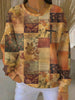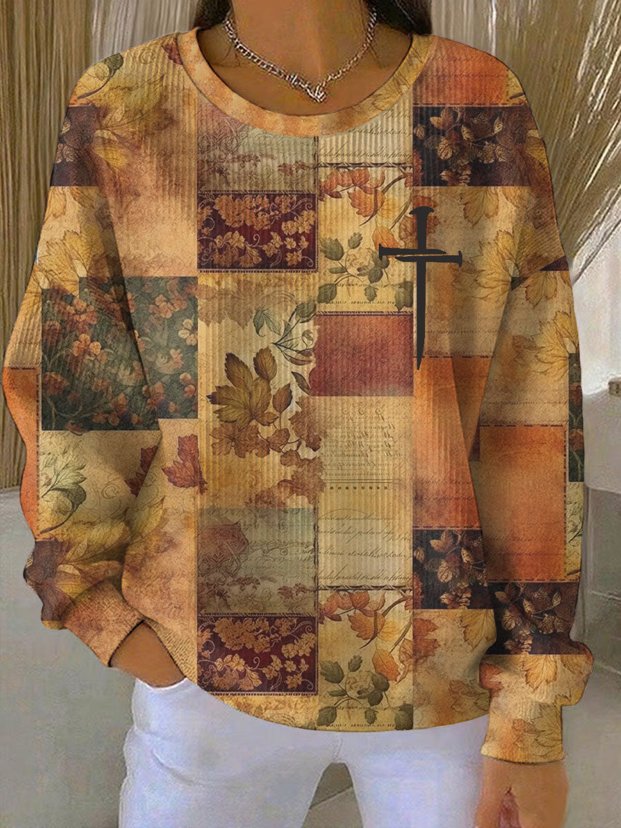 Women's Casual Retro Contrast Color Faith Texture Ribbed Round-Neck Sweatshirt