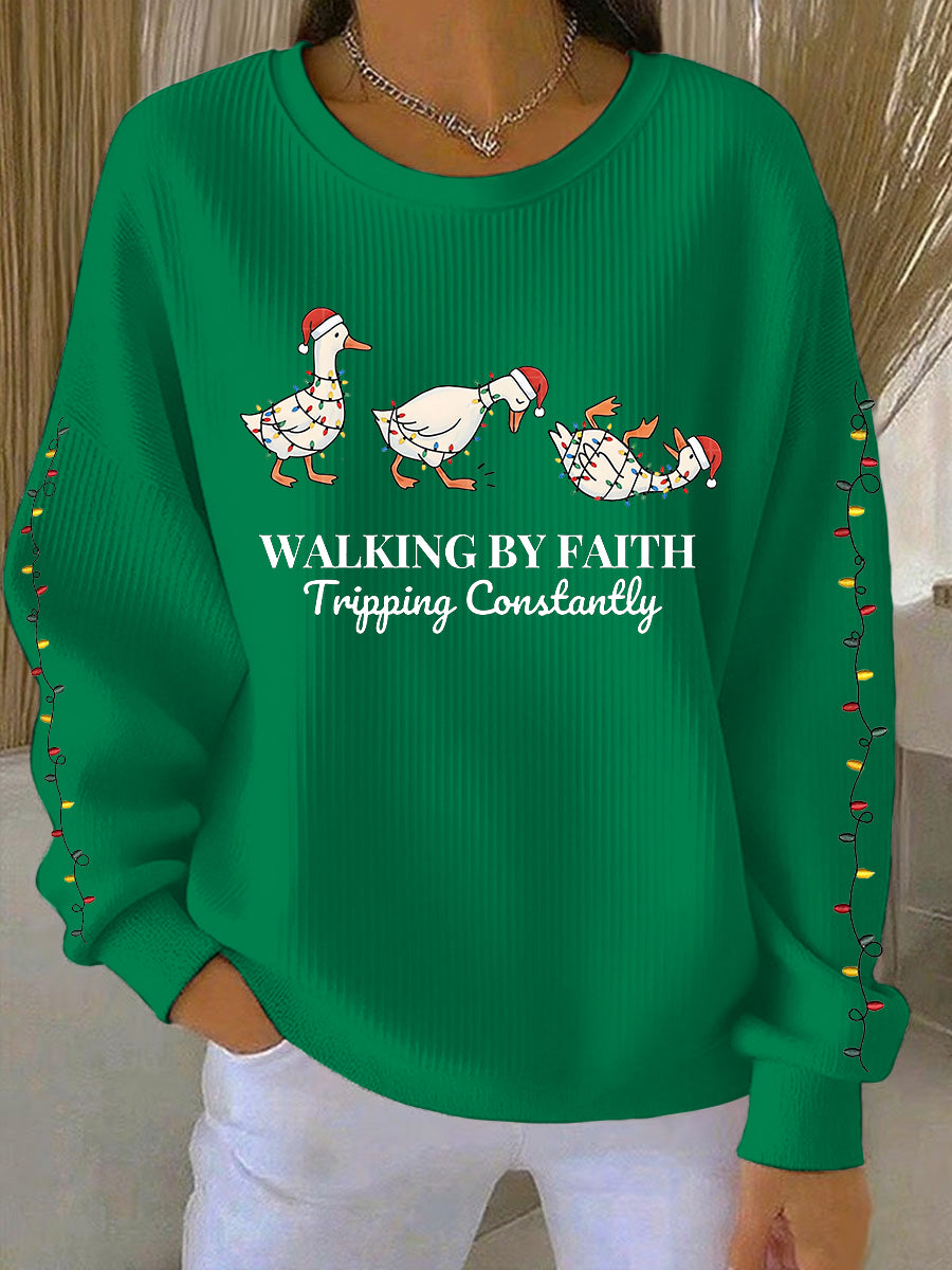 Women's Funny Christmas Goose Walking By Faith Tripping Constantly Ribbed Round-Neck Sweatshirt