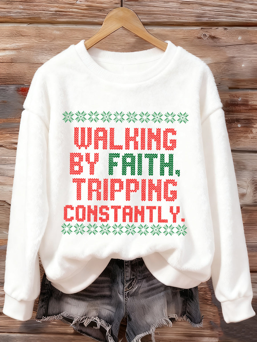 Women's Funny Christmas Walking By Faith Tripping Constantly Print Casual Flannel Sweatshirt