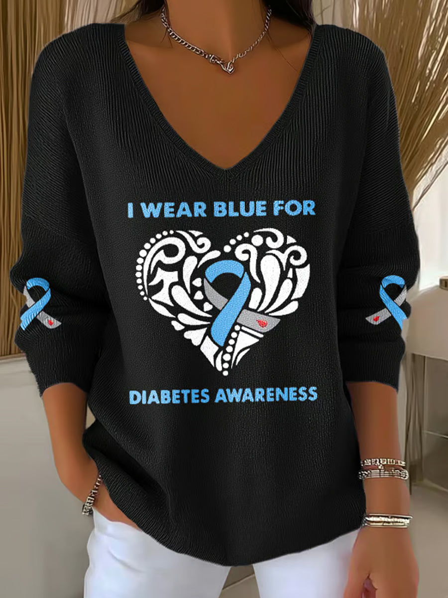 Women's I'M Wear Blue For Diabetes Awareness Print V Neck Sweater