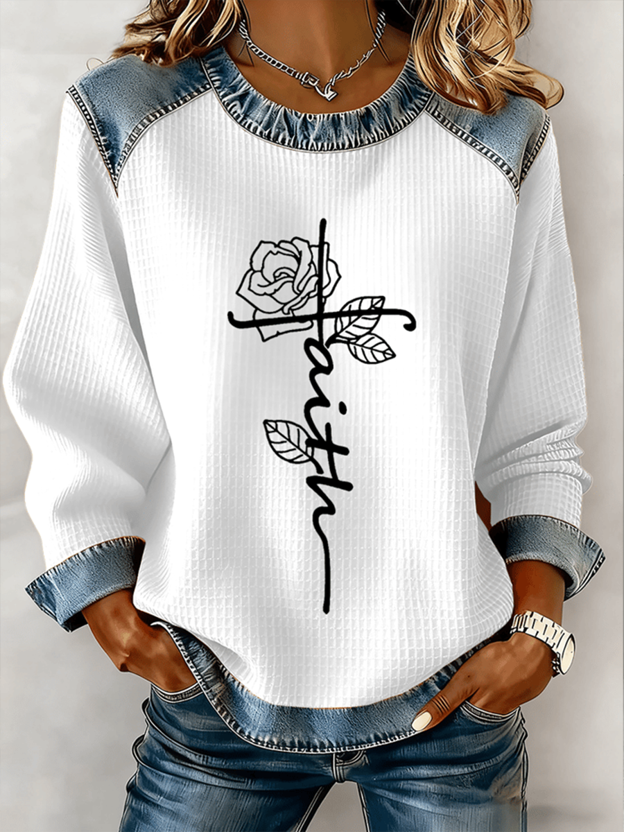 Women's Jesus Cross Flowers Denim Patchwork Top